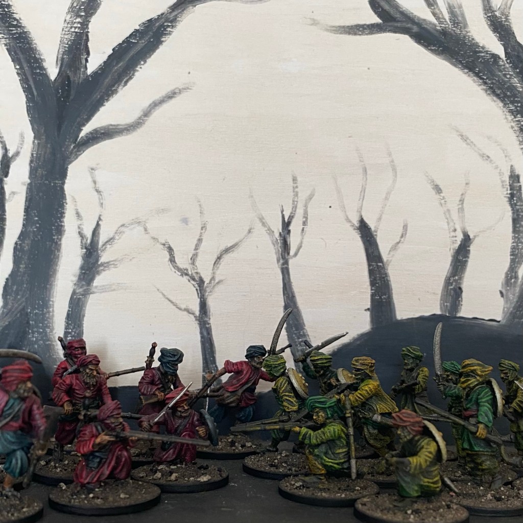 I wanted an older look for my warbands so I opted to leave the Martini-Henry Rifles behind, additionally I wanted every figure to be equipped roughly the same, so there’s a lot of Jezails swung over backs, shields and swords hanging from belts etc.