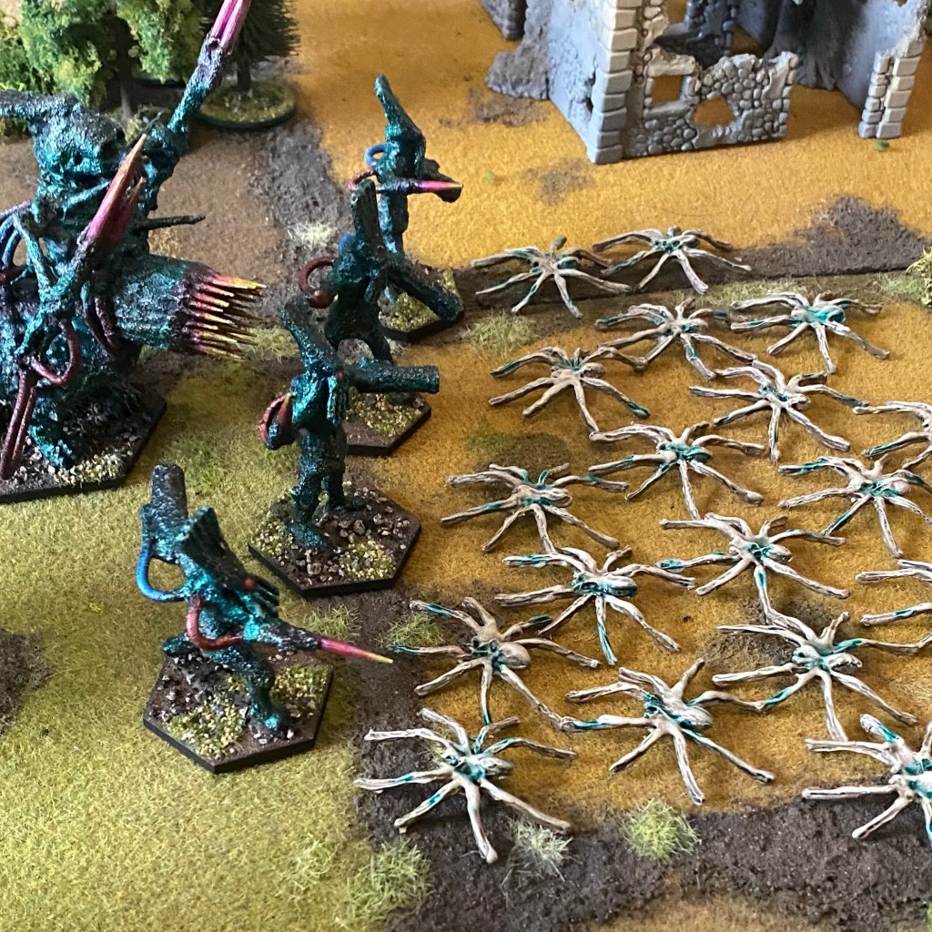 Using a permanent chrome paint pen, I drew on the spiders to add a little detail and colour, it certainly worked but wasn’t what I had imagined for the Khydran Enclaves. Even this also eventually began to chip.