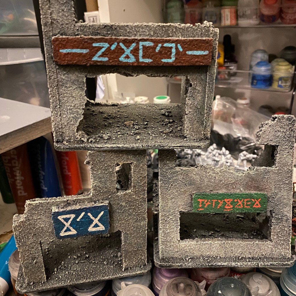 Painting was the more realistic approach of a lot of watered down layers of a random mix of colours with a light tan, almost white drybrush to tie everything together and I got back into writing Jendari for my signs.