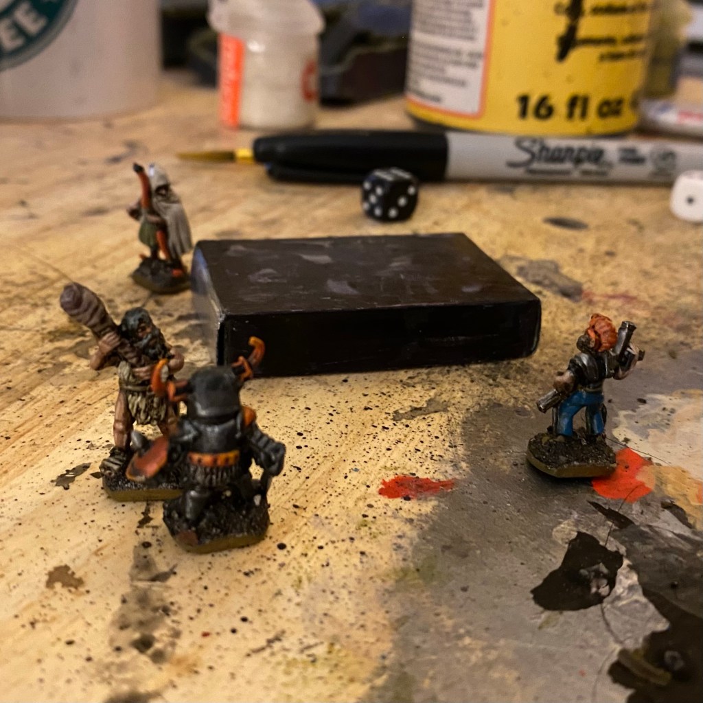 I’m also currently working on making my box look like some usable terrain, which I began by painting, but strangely my matchbox was engineered well enough that the additional thickness from the paint actually made it difficult to close the box, so after a little sanding I’ve resorted to marker pens. I’ve also strengthened the box by soaking the card in super glue, so it feels a little more like thin plastic now. I’d recommend this step if you’re planning on having your box last for a while.