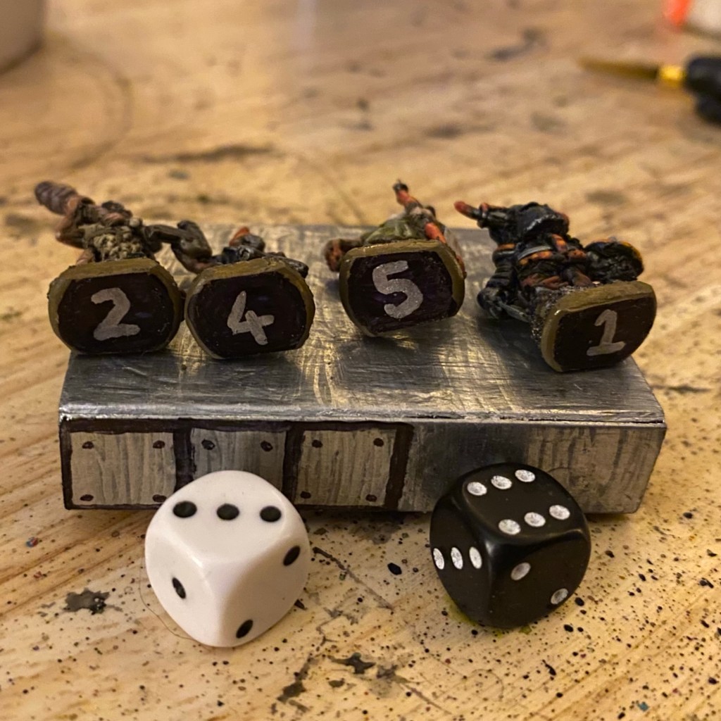 While continuing to ponder my Matchbox game with my spare grey matter while at work today, I imagined a game with a single stat. Since there won’t be much room for stats! And along the lines of SKIRMASH I want that stat to be balanced whether it’s low or high. Keeping things simple and using the dice I have that will fit in the box, means that stat will be a 1-5 so it can be beaten on a D6. The single stat from 1-5 also means it can be comfortably written on the bottom of a base.
