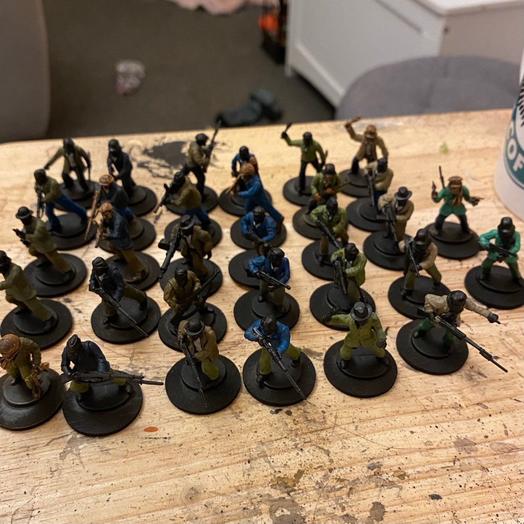 So that’s my 32 Partisans painted. I’ve got the MG team, mortar team and anti-tank gun to go. I’d like to work in a unique looking squad at some point, possibly some free French police. I’ll probably actually need some vehicles and maybe a looted tank.