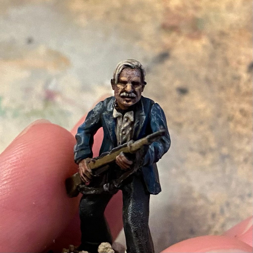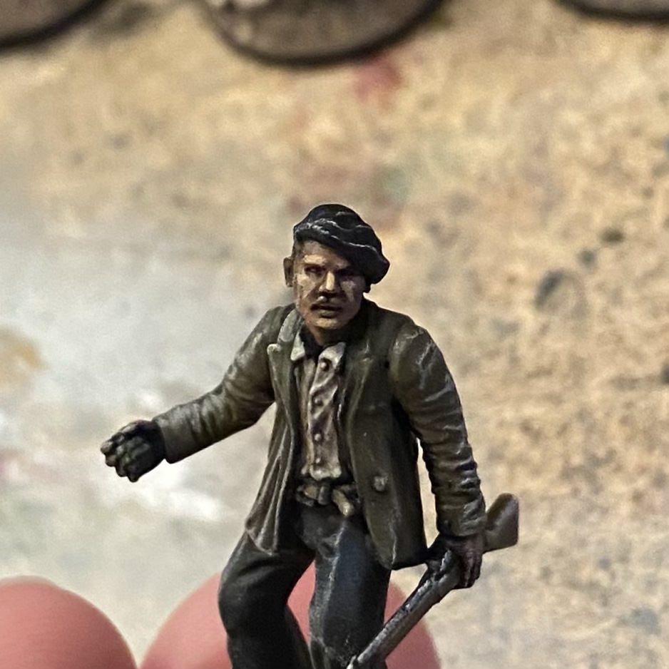 Russians on the whole get sprayed light brown, you pick out faces and hands, boots, blanket rolls, banding and finally helmets and guns. Give them an all over wash, followed by a bone drybrush and you’re good.