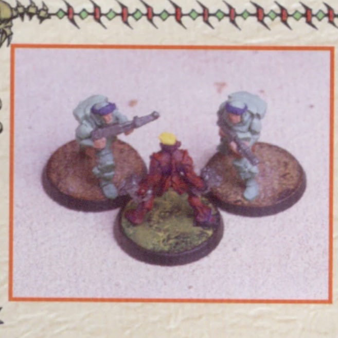 All the miniatures came pre-assembled (bar vehicles which required some light assembly) and sort of pre-painted. I did have the ‘Skirmish’ starter set. However everything has been lost to time. So here is a picture from the rulebook so you have an idea of what the minis looked like:
