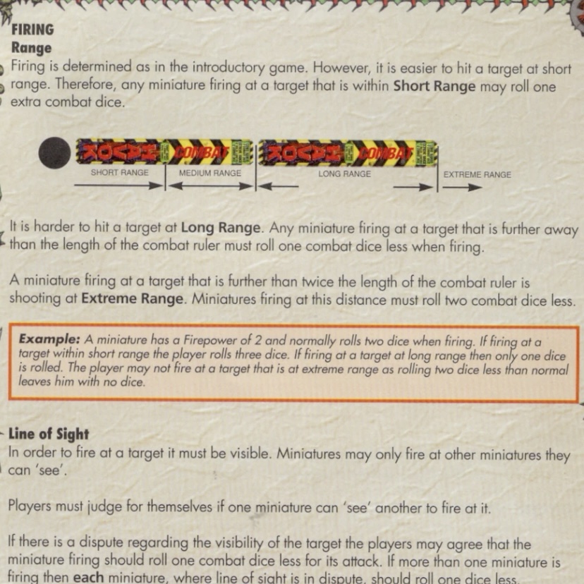 Here’s an example… when a figure or group of figures shoots you check their Firepower stat, and that’s the number of combat dice you roll per figure. So five guys with Firepower 2 get 10 dice. Easy enough. Here’s where range comes into effect however.