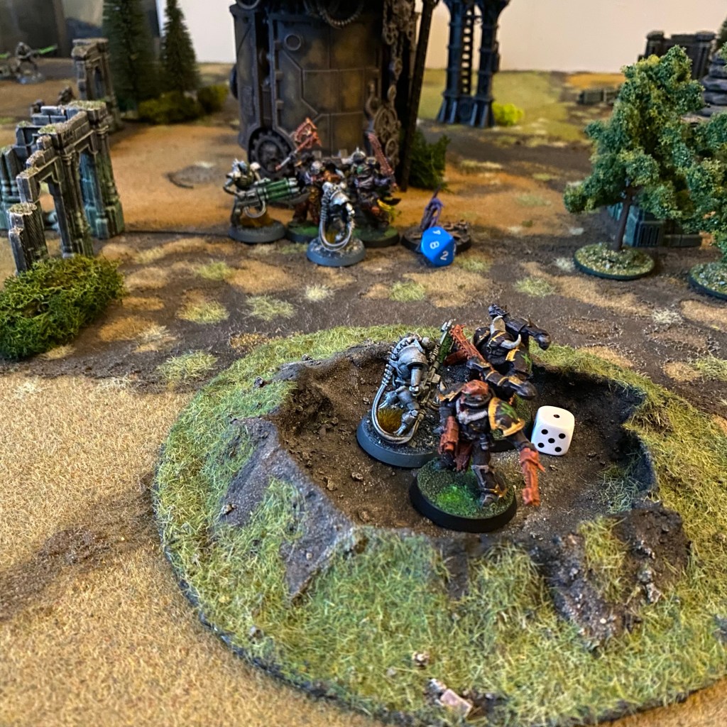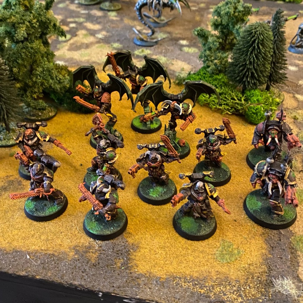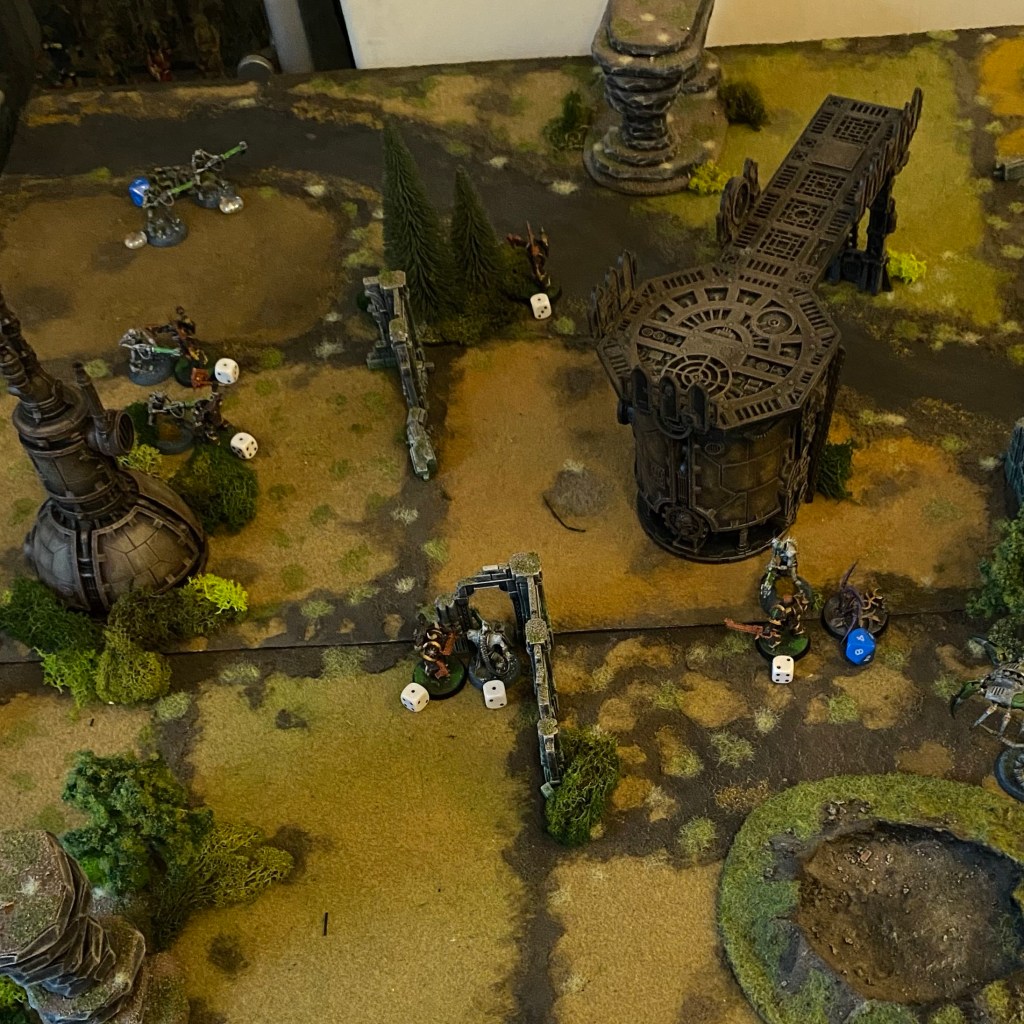 The scattered Space Warriors was due to the morale rules. When a unit is at half strength (I went with half wounds), they take a morale test. This may have them carry on as normal, carry on but suffer negatives to their attacks, or retreat to the closest board edge. And ‘closest’ is what caused issues, as units may try to retreat through the enemy lines (which is what happened here), so I think they should probably head back towards their starting edge, or to speed things up maybe just vanish entirely.