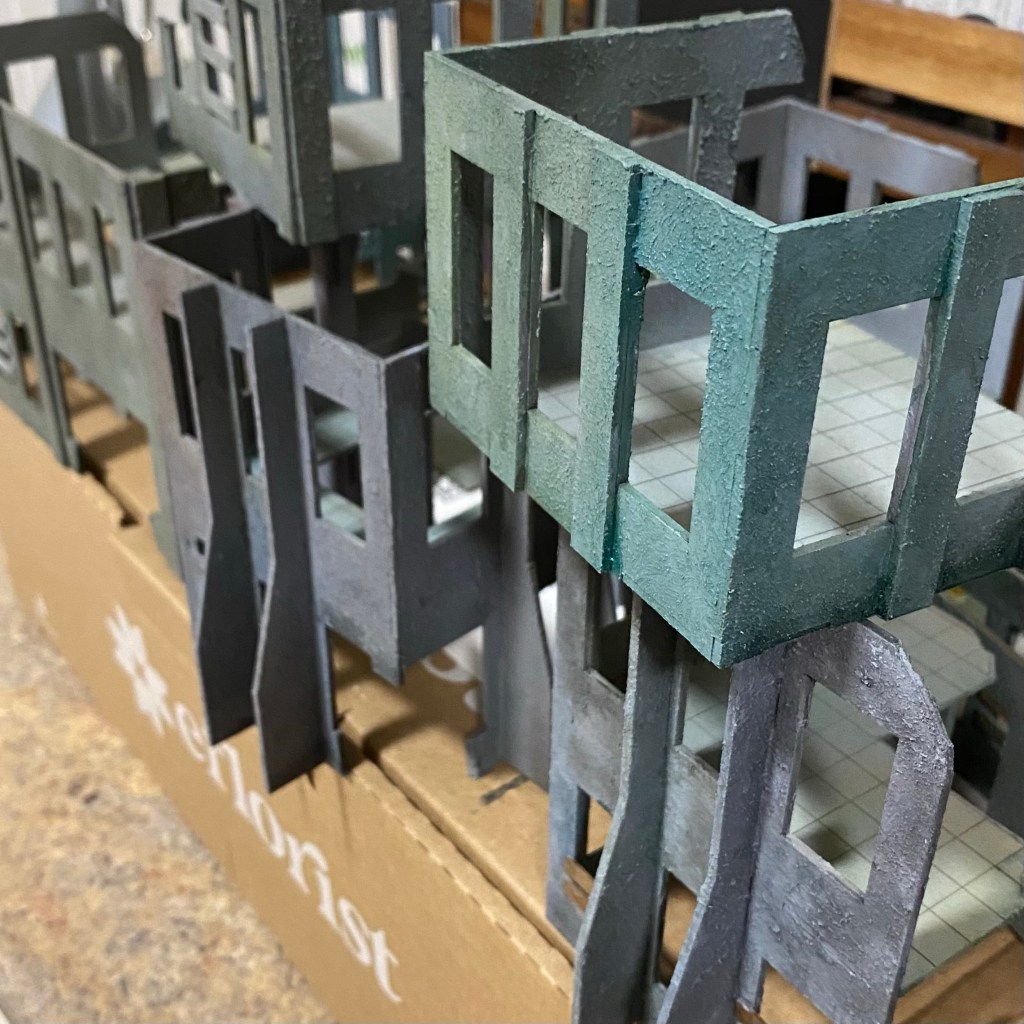I put the entire set together with Mod Podge, and then set about adding texture, stippling on my usual goop. I battle damaged some of the walls and added some boards to some of the windows using coffee stirrers.