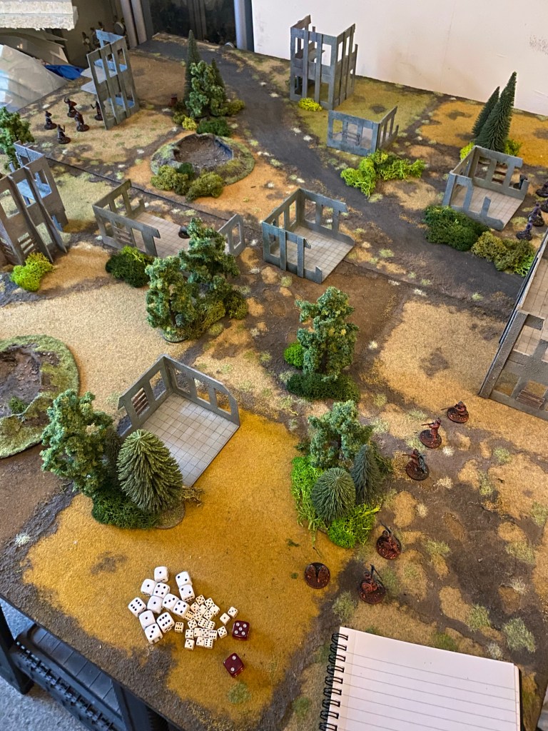 That’s because we’re going to figure out the rules as we go. So I’ve got a pile of dice, a notepad, a tape measure and some minis on a 4’x4’ table.