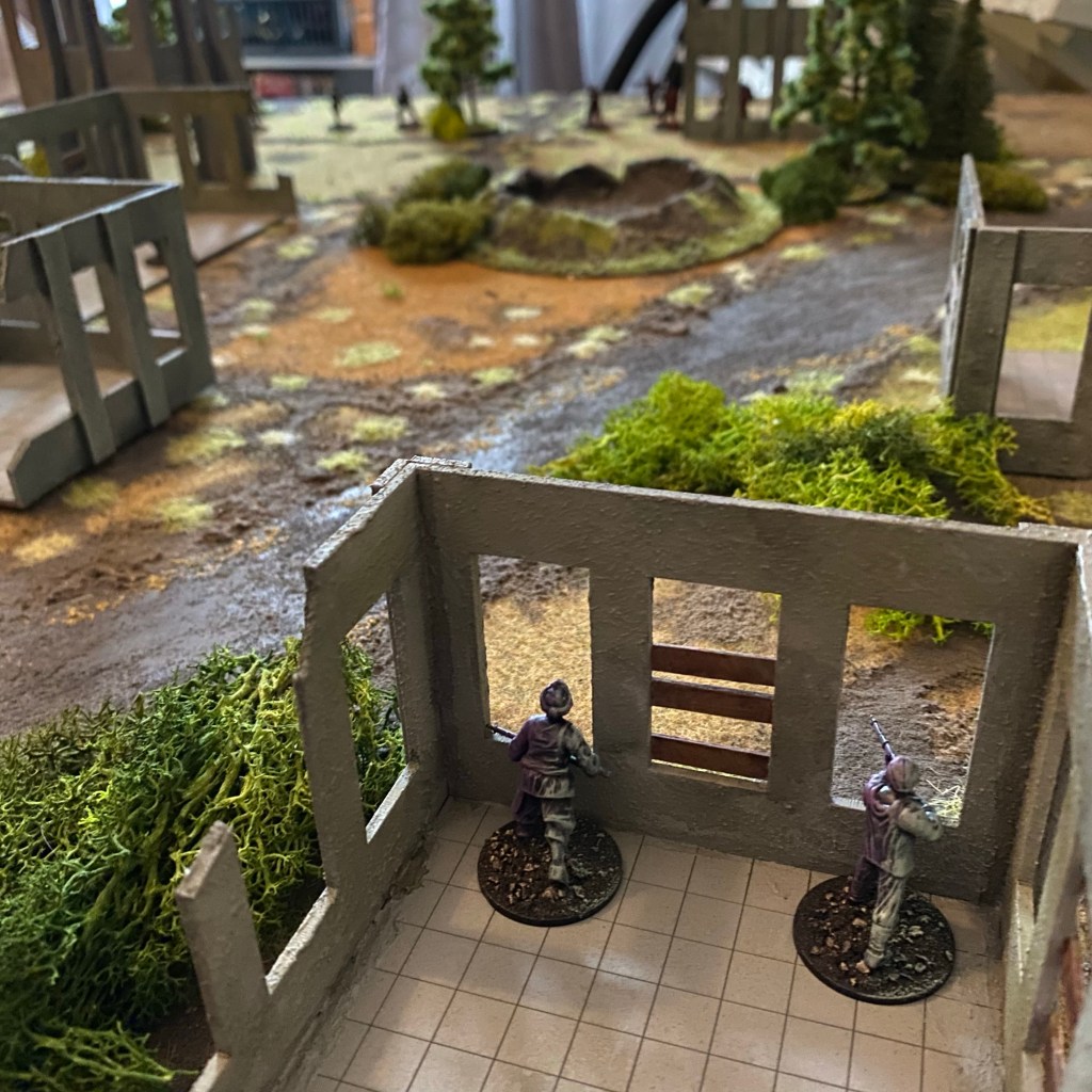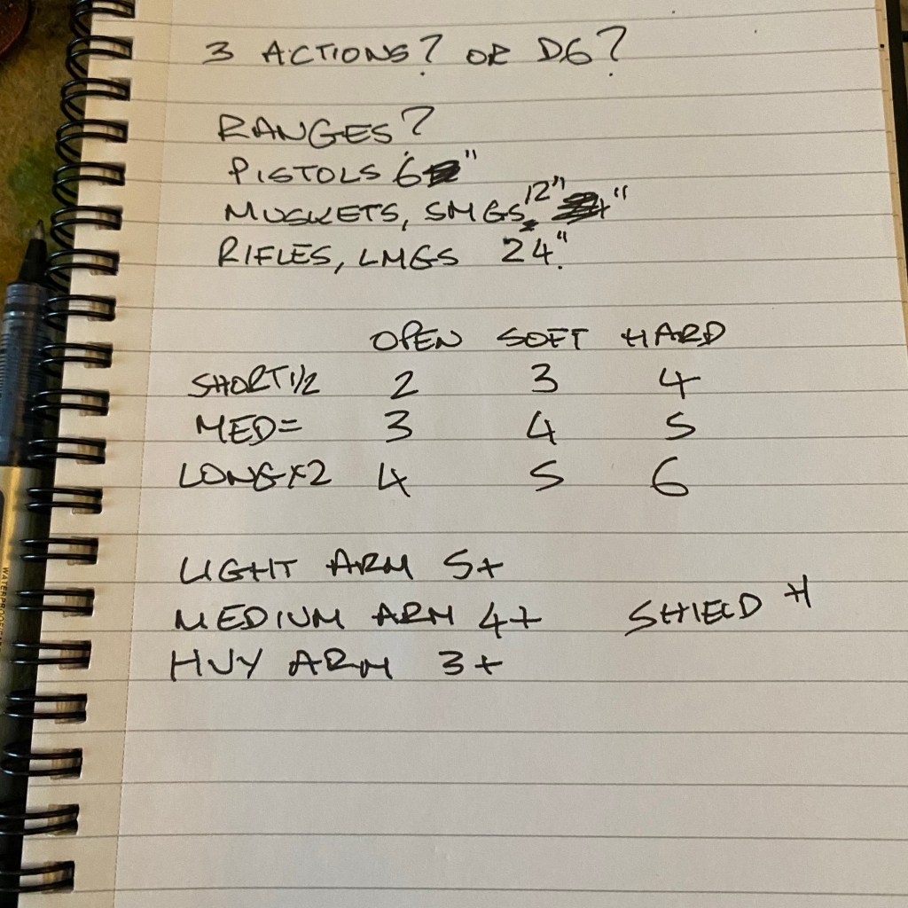 Roll to hit, make saves, and then the target takes a number of hits. I mark them on the target with a die. When that figure next activates they get their D6 actions, and the number of actions they get is reduced by the number of hits that they took. If they are reduced to less than zero actions then they are killed. A roll of 6 however, will always remove all of their hits regardless of how many they have taken. It’s a way of baking suppression into a rule set without additional mechanics.