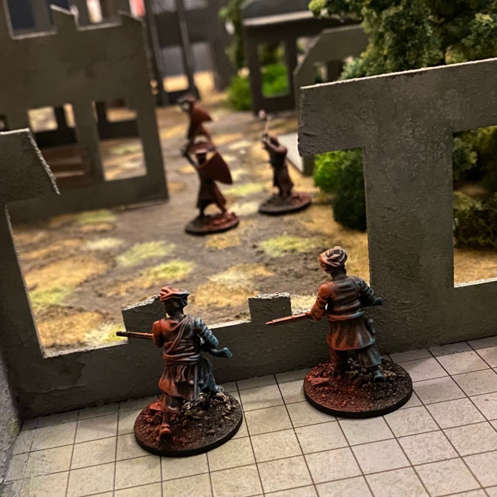 The two forces deploy within 12” of opposite ends, of a 4’x4’ table, you score 1 point for a kill and two for moving a guy off of the board at your opponent’s end, first to 10 points wins.