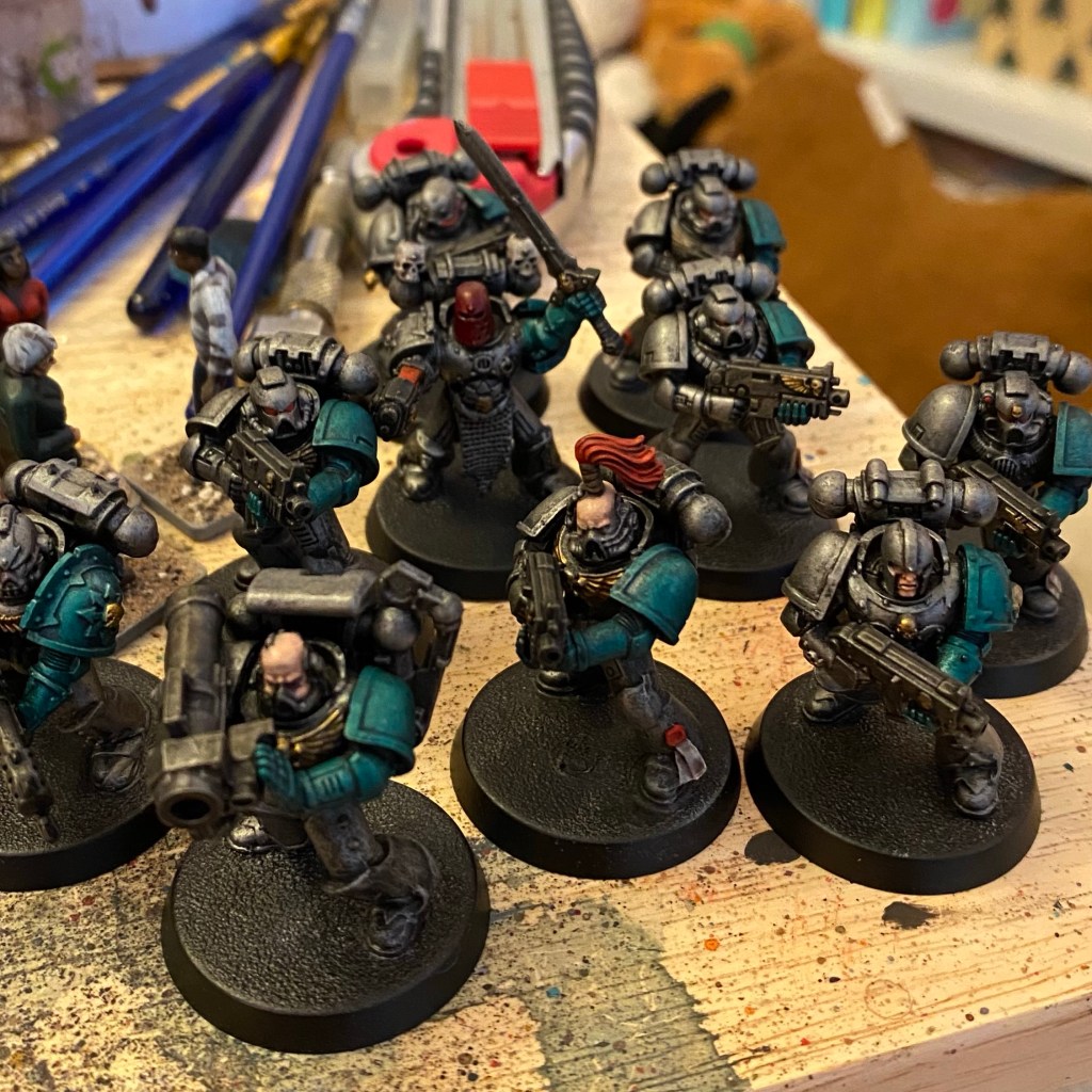 As for painting my company, I’ve settled on the scheme below. Prime black, drybrush silver, contrast green the left arm, contrast the guns darker, then paint whatever details they might have. My marines are renegades so the details are pretty varied.