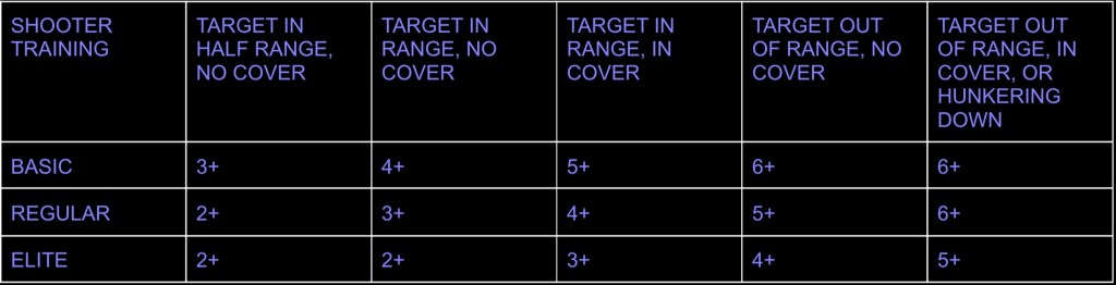 Elite – 3+, Regular – 4+, Basic 5+, Any Panicked or Hunkering Down Figures – 6+,