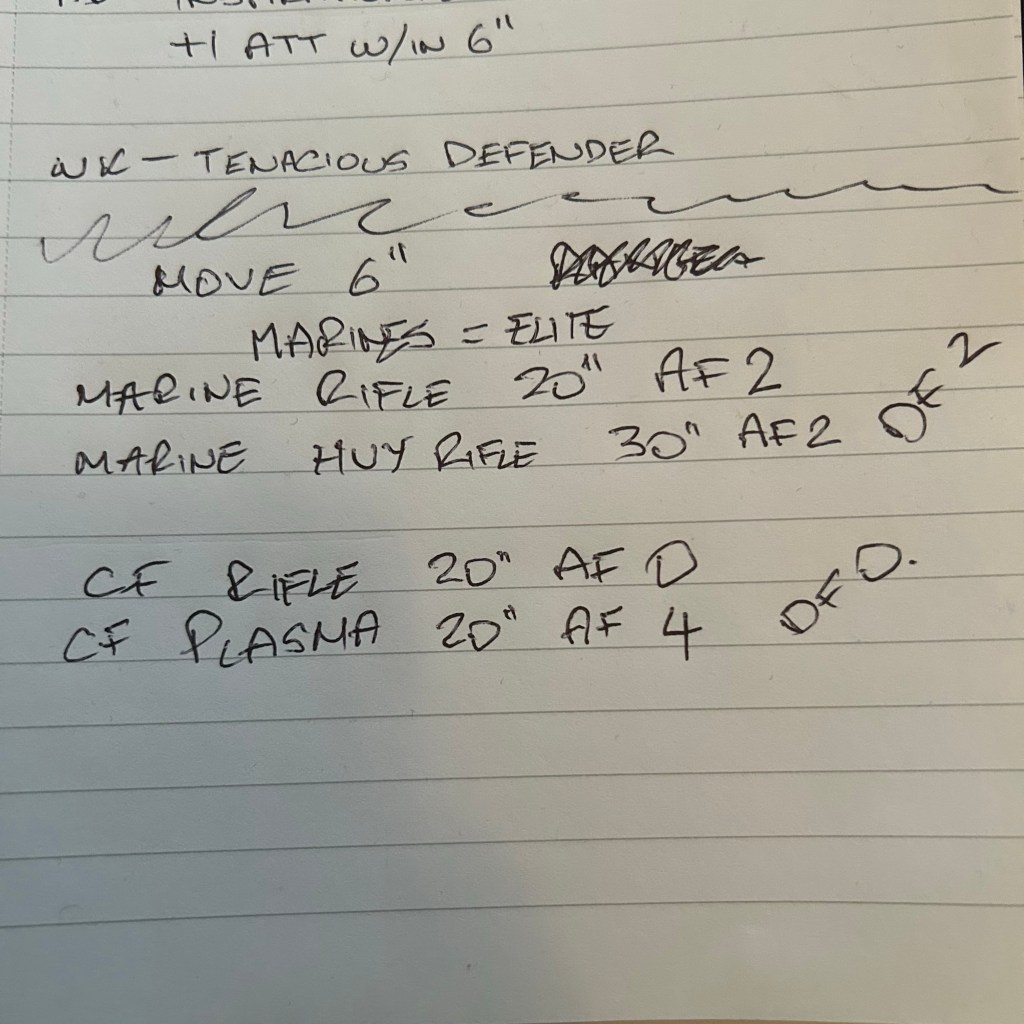 Everyone gets a standard 6” move, because they’re all humans. The Marines, are Elite meaning they get +1 to their hit rolls. They have rifles (20” range) or heavy rifles (30” range) which all have an ‘attack factor’ of 2. The Marines also have a defence of 2.