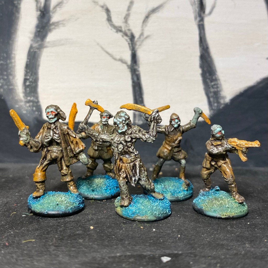 The figures were first given additional texture with a coat of Typhus Corrosion, then painted all over in a dark brown, I then added random splotches of a watered down ochre and pastel green, just for variation. I picked out all of the skin with a pale blue grey, and picked out the weapons with orange. Everything got a wash of watered down black, and a bone drybrush. I then picked out the weapons again with orange to make them stand out.