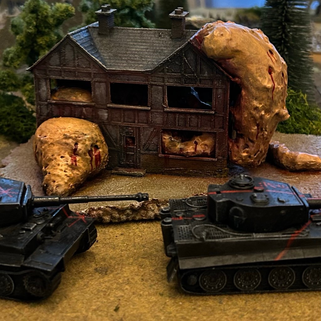 I imagine the underworld is a bit ‘chunky’, where parts of the overworld or projections of it have been torn apart and distributed randomly across the landscape. So you may have part of a WW2 bunker fused with an Ancient Greek temple, or a Victorian cottage in the middle of a Roman fort. It might even be fun to grab multiple iconic buildings from battles like La Haye Sainte or the Reichstag and plonk them on the same table.