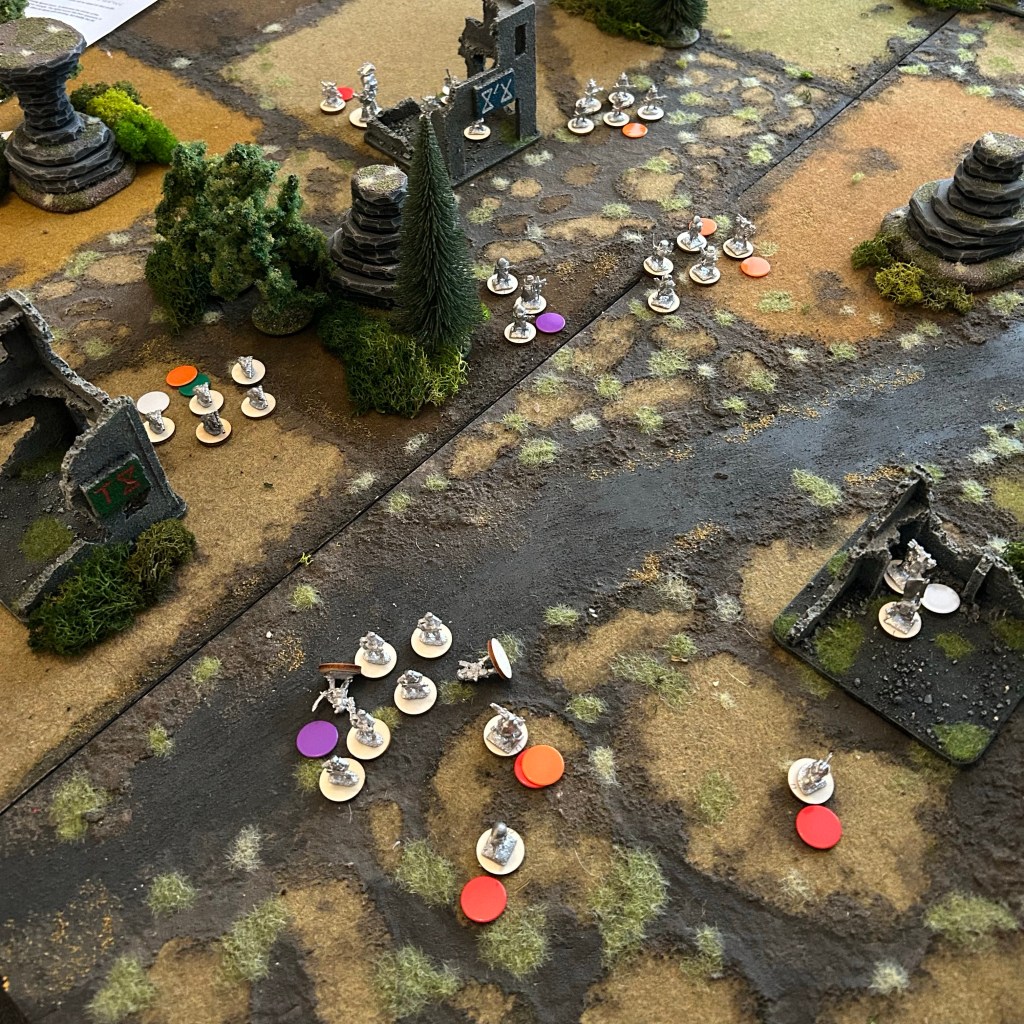 I could add in an initiative stat for turn order, or I’ll go with the classic – Side A moves, Side B shoots, Side A shoots, Side B moves, which is definitely oldschool appropriate, popping up both in Donald Featherstone’s rules and Laserburn Imperial Commander.